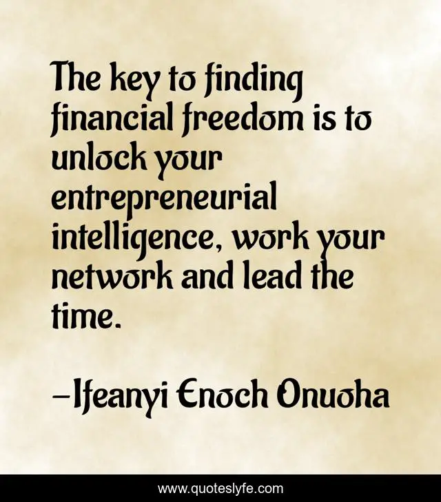 This page presents the quote "The key to finding financial freedom is to unlock your entrepreneurial intelligence, work your network and lead the time.". Author of this quote is Ifeanyi Enoch Onuoha. This quote is about hinovelty, wealth-creation, money, entrepreneurship, magnet, entrepreneur, ifeanyi-enoch-onuoha, cash-flow, midas-touch,.