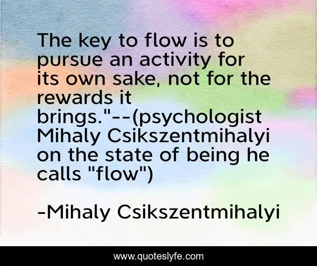 This page presents the quote "The key to flow is to pursue an activity for its own sake, not for the rewards it brings."--(psychologist Mihaly Csikszentmihalyi on the state of being he calls "flow")". Author of this quote is Mihaly Csikszentmihalyi. This quote is about enthusiasm, creativity, inspirational, quiet-the-book,.