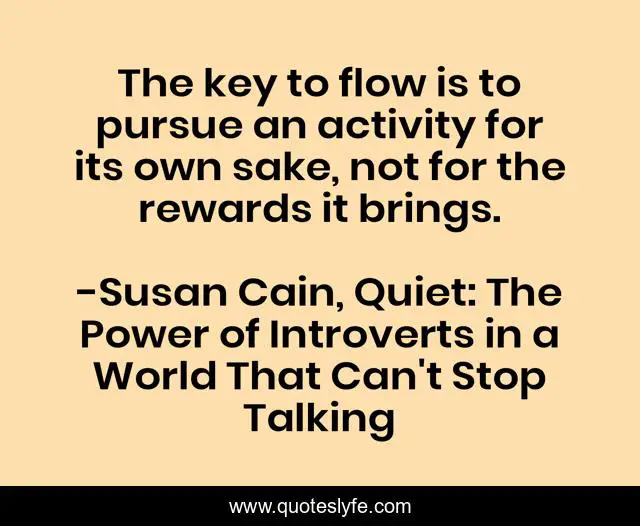 This page presents the quote "The key to flow is to pursue an activity for its own sake, not for the rewards it brings.". Author of this quote is Susan Cain, Quiet: The Power of Introverts in a World That Can't Stop Talking. This quote is about rewards, introverts, success, passion, inspirational, enthusiasm,.