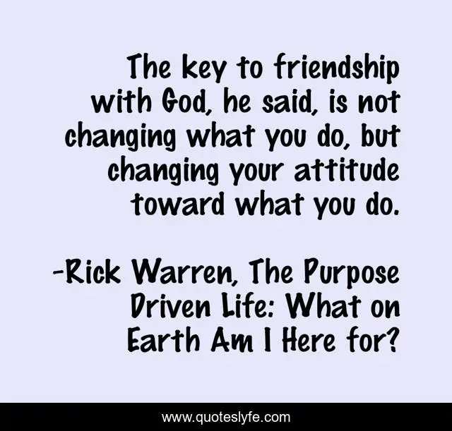 This page presents the quote "The key to friendship with God, he said, is not changing what you do, but changing your attitude toward what you do.". Author of this quote is Rick Warren, The Purpose Driven Life: What on Earth Am I Here for?. This quote is about behaviour, attitude,.