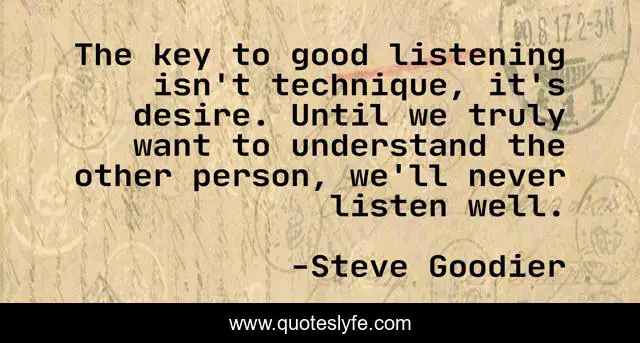 This page presents the quote "The key to good listening isn't technique, it's desire. Until we truly want to understand the other person, we'll never listen well.". Author of this quote is Steve Goodier. This quote is about relationships, understanding-others, listening-skills, understanding, listening-to-others, listening, listen,.