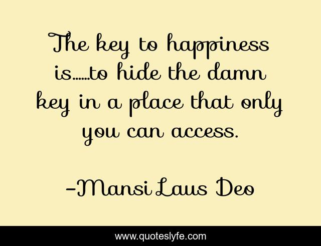This page presents the quote "The key to happiness is......to hide the damn key in a place that only you can access.". Author of this quote is Mansi Laus Deo. This quote is about life-philosophy, life, happiness-advice, happiness, life-lessons,.