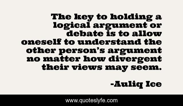 This page presents the quote "The key to holding a logical argument or debate is to allow oneself to understand the other person’s argument no matter how divergent their views may seem.". Author of this quote is Auliq Ice. This quote is about stupidity-of-man, political-campaigns, ignorance, governance, understanding, stupidity, debating, oscar-auliq-ice-jr, stupid-people,.