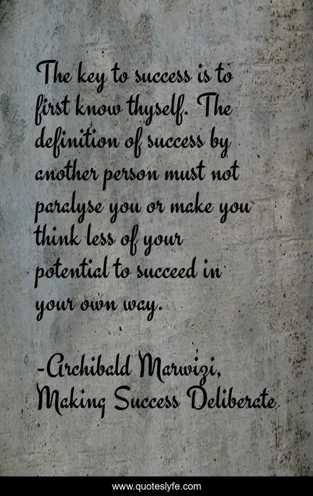 This page presents the quote "The key to success is to first know thyself. The definition of success by another person must not paralyse you or make you think less of your potential to succeed in your own way.". Author of this quote is Archibald Marwizi, Making Success Deliberate. This quote is about life, success, behaviour, attitude, legacy, growth, purpose, inspirational, leadership,.