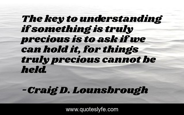 This page presents the quote "The key to understanding if something is truly precious is to ask if we can hold it, for things truly precious cannot be held.". Author of this quote is Craig D. Lounsbrough. This quote is about possession, own, wealth, true-wealth, treasure, riches, valuable, held, hold,.
