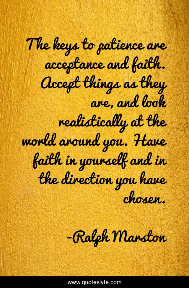 This page presents the quote "The keys to patience are acceptance and faith. Accept things as they are, and look realistically at the world around you. Have faith in yourself and in the direction you have chosen.". Author of this quote is Ralph Marston. This quote is about faith, world, yourself,.