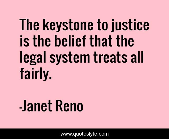 This page presents the quote "The keystone to justice is the belief that the legal system treats all fairly.". Author of this quote is Janet Reno. This quote is about justice, belief, system,.