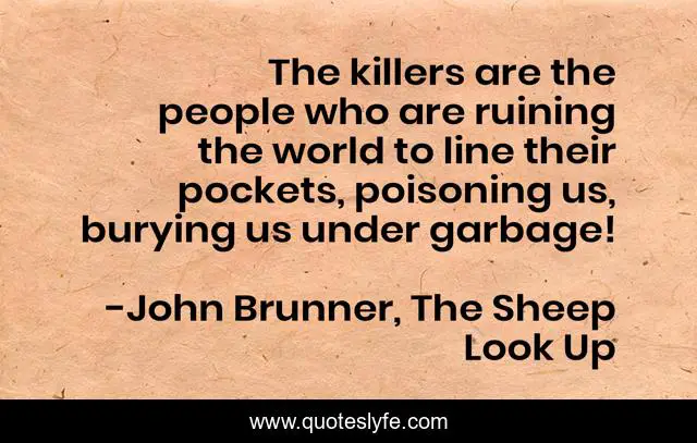 This page presents the quote "The killers are the people who are ruining the world to line their pockets, poisoning us, burying us under garbage!". Author of this quote is John Brunner, The Sheep Look Up. This quote is about environment, garbage, profits,.