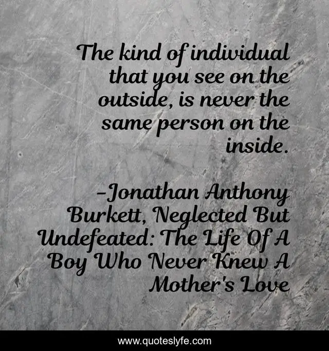 "Jonathan Anthony Burkett, Neglected But Undefeated: The Life Of A Boy Who Never Knew A Mother's Love Quotes." Quoteslyfe.com, 2025. Sun. 07 Dec. 2025. <https://www.quoteslyfe.com/quote/The-kind-of-individual-that-you-see-86394>.