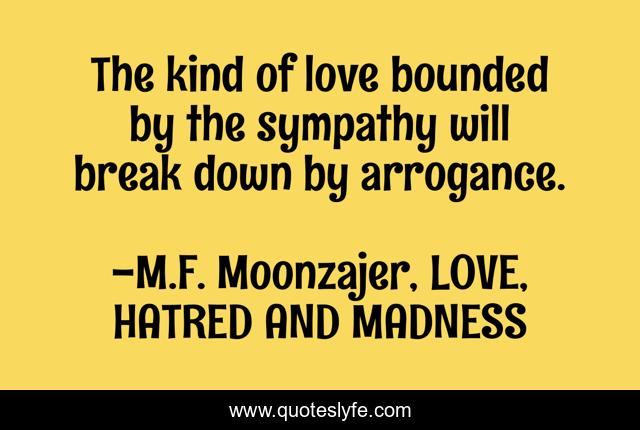 This page presents the quote "The kind of love bounded by the sympathy will break down by arrogance.". Author of this quote is M.F. Moonzajer, LOVE, HATRED AND MADNESS. This quote is about love, arrogance, break-down, sympathy, bounded, affection,.