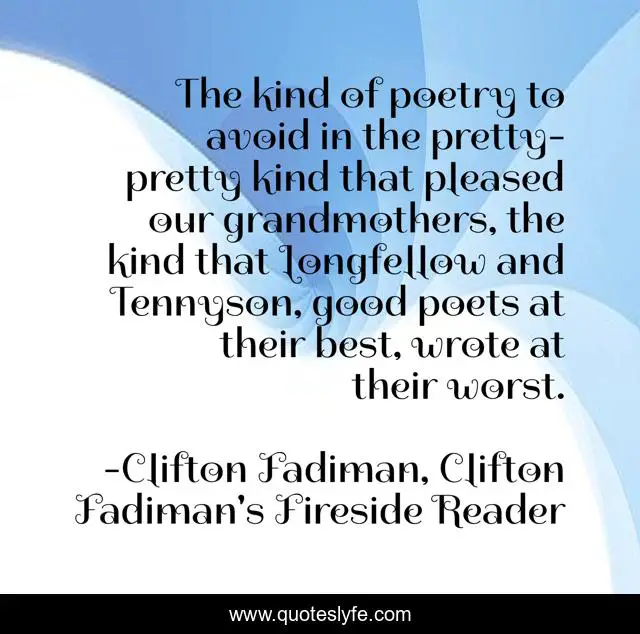 This page presents the quote "The kind of poetry to avoid in the pretty-pretty kind that pleased our grandmothers, the kind that Longfellow and Tennyson, good poets at their best, wrote at their worst.". Author of this quote is Clifton Fadiman, Clifton Fadiman's Fireside Reader. This quote is about poems, longfellow, tennyson, poetry,.