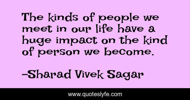 This page presents the quote "The kinds of people we meet in our life have a huge impact on the kind of person we become.". Author of this quote is Sharad Vivek Sagar. This quote is about impact, life, people, inspirational, enthusiasm, personality,.
