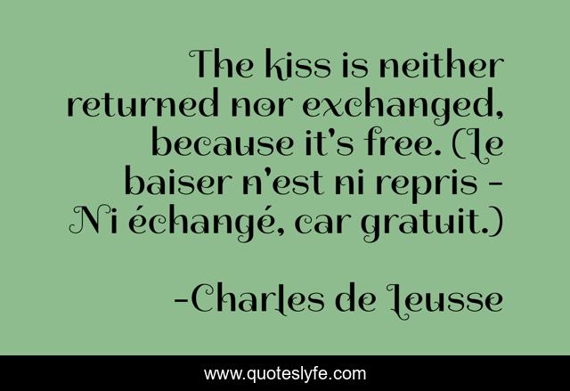 This page presents the quote "The kiss is neither returned nor exchanged, because it's free. (Le baiser n'est ni repris - Ni échangé, car gratuit.)". Author of this quote is Charles de Leusse. This quote is about exchanged, baiser, free, échangé, kiss, gratuit,.