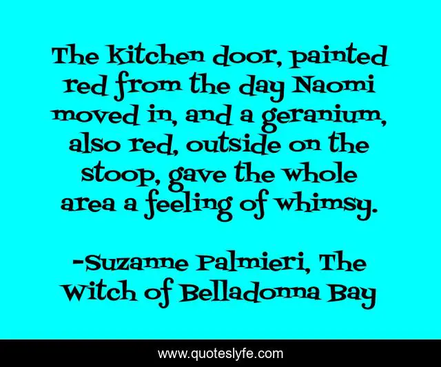 This page presents the quote "The kitchen door, painted red from the day Naomi moved in, and a geranium, also red, outside on the stoop, gave the whole area a feeling of whimsy.". Author of this quote is Suzanne Palmieri, The Witch of Belladonna Bay. This quote is about kitchens, home_and_heart, witches, beautiful-imagery,.