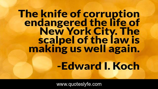 This page presents the quote "The knife of corruption endangered the life of New York City. The scalpel of the law is making us well again.". Author of this quote is Edward I. Koch. .