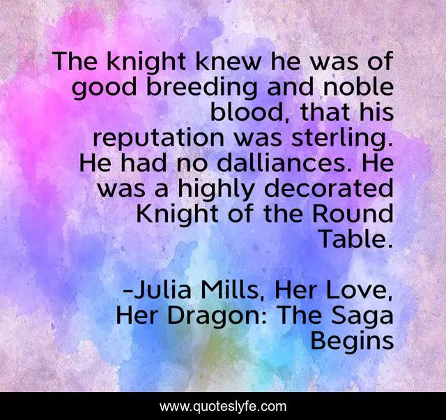 This page presents the quote "The knight knew he was of good breeding and noble blood, that his reputation was sterling. He had no dalliances. He was a highly decorated Knight of the Round Table.". Author of this quote is Julia Mills, Her Love, Her Dragon: The Saga Begins. This quote is about knights-of-the-round-table, king-arthur-s-knights, paranormal-romance, dragons-romance,.