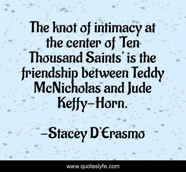This page presents the quote "The knot of intimacy at the center of 'Ten Thousand Saints' is the friendship between Teddy McNicholas and Jude Keffy-Horn.". Author of this quote is Stacey D'Erasmo. This quote is about intimacy, center, between,.