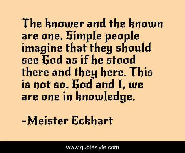 The knower and the known are one. Simple people imagine that they should see God as if he stood there and they here. This is not so. God and I, we are one in knowledge.
