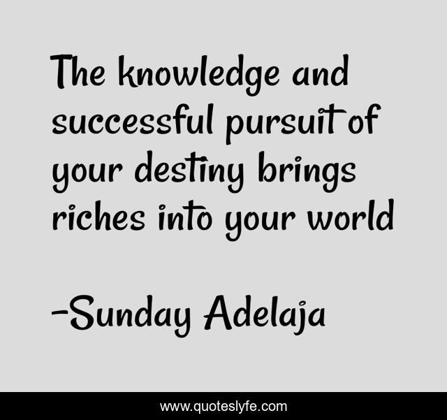 This page presents the quote "The knowledge and successful pursuit of your destiny brings riches into your world". Author of this quote is Sunday Adelaja. This quote is about destiny, success, self-knowledge, riches, nation, society, purpose, truth, world,.