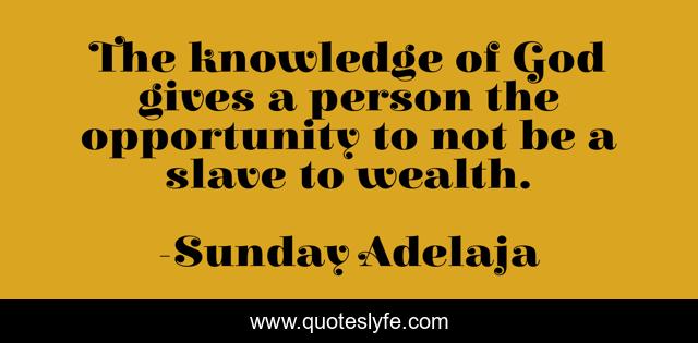 This page presents the quote "The knowledge of God gives a person the opportunity to not be a slave to wealth.". Author of this quote is Sunday Adelaja. This quote is about opportunity, slave, knowledge, wealth,.