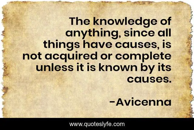 This page presents the quote "The knowledge of anything, since all things have causes, is not acquired or complete unless it is known by its causes.". Author of this quote is Avicenna. This quote is about known, things, anything,.