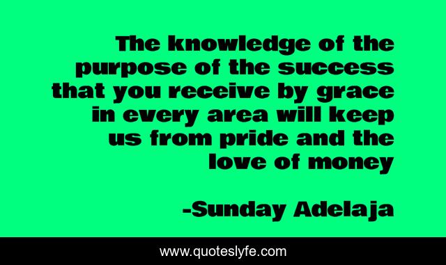 This page presents the quote "The knowledge of the purpose of the success that you receive by grace in every area will keep us from pride and the love of money". Author of this quote is Sunday Adelaja. This quote is about prosperity, love, knowledge, success, golden-truth, receive, golden-rules, area, riches,.