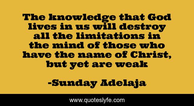 This page presents the quote "The knowledge that God lives in us will destroy all the limitations in the mind of those who have the name of Christ, but yet are weak". Author of this quote is Sunday Adelaja. This quote is about limitations, christ, god, mind, lives, destroy, knowledge, weak, name,.