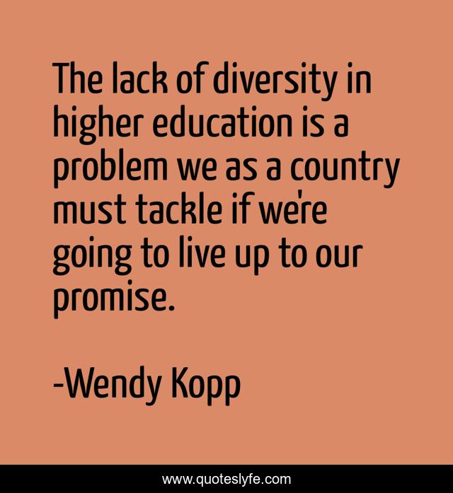 This page presents the quote "The lack of diversity in higher education is a problem we as a country must tackle if we're going to live up to our promise.". Author of this quote is Wendy Kopp. This quote is about live, diversity, problem,.