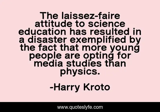 This page presents the quote "The laissez-faire attitude to science education has resulted in a disaster exemplified by the fact that more young people are opting for media studies than physics.". Author of this quote is Harry Kroto. This quote is about science, education, media,.