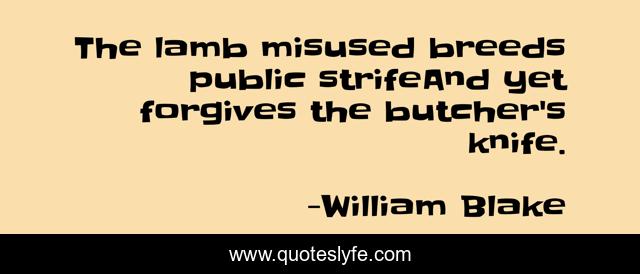 This page presents the quote "The lamb misused breeds public strifeAnd yet forgives the butcher's knife.". Author of this quote is William Blake. This quote is about vegetarianism, animal-cruelty, poetry, hypocrisy,.