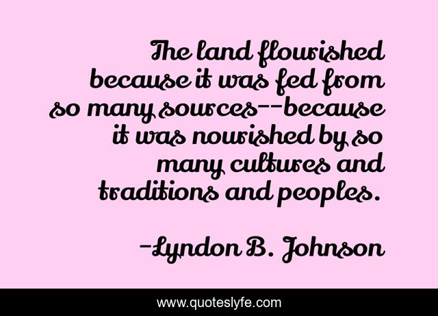 This page presents the quote "The land flourished because it was fed from so many sources--because it was nourished by so many cultures and traditions and peoples.". Author of this quote is Lyndon B. Johnson. This quote is about president, statue-of-liberty-united-states, immigration, history,.
