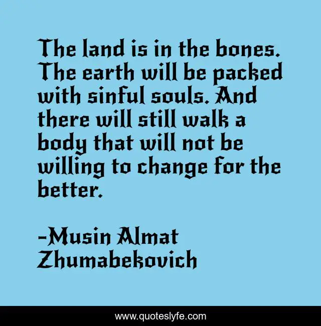 This page presents the quote "The land is in the bones. The earth will be packed with sinful souls. And there will still walk a body that will not be willing to change for the better.". Author of this quote is Musin Almat Zhumabekovich. .