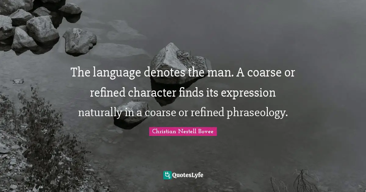 This page presents the quote "The language denotes the man. A coarse or refined character finds its expression naturally in a coarse or refined phraseology.". Author of this quote is Christian Nestell Bovee. This quote is about men, character, refined, expression, language, coarse,.