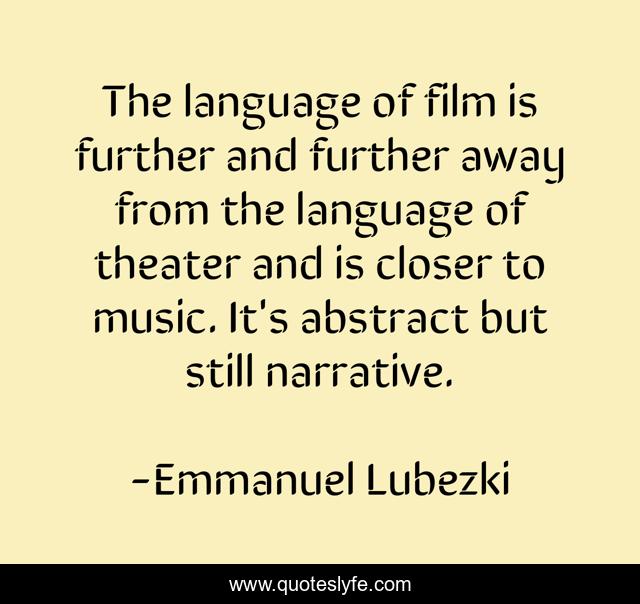 This page presents the quote "The language of film is further and further away from the language of theater and is closer to music. It's abstract but still narrative.". Author of this quote is Emmanuel Lubezki. This quote is about abstract, language, film,.