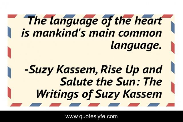 This page presents the quote "The language of the heart is mankind's main common language.". Author of this quote is Suzy Kassem, Rise Up and Salute the Sun: The Writings of Suzy Kassem. This quote is about heart, love, language, communication, words, commonalities, suzy-kassem, affection, loving,.