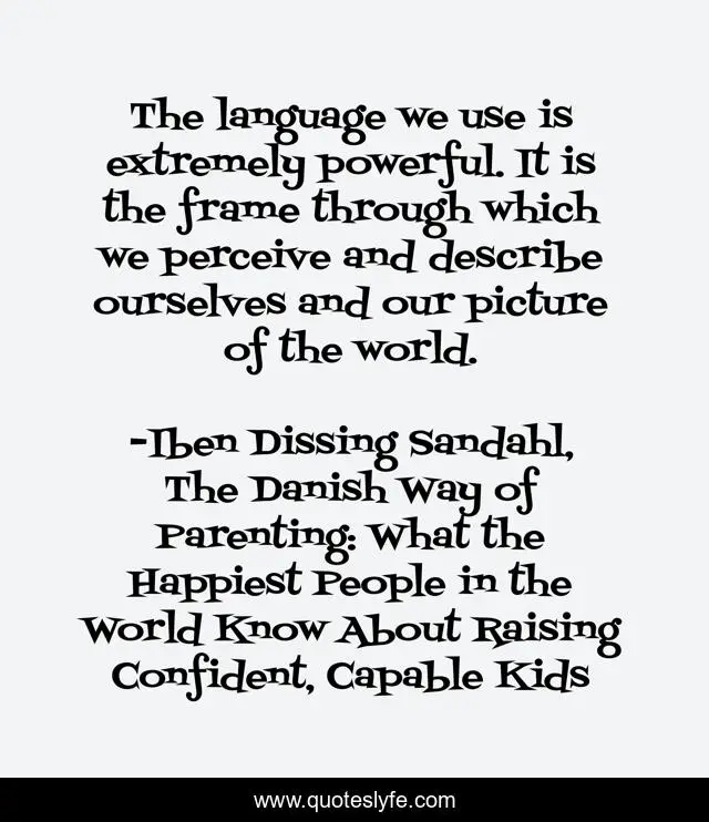 This page presents the quote "The language we use is extremely powerful. It is the frame through which we perceive and describe ourselves and our picture of the world.". Author of this quote is Iben Dissing Sandahl, The Danish Way of Parenting: What the Happiest People in the World Know About Raising Confident, Capable Kids. This quote is about life, describing-feelings, language, reframing, personality,.