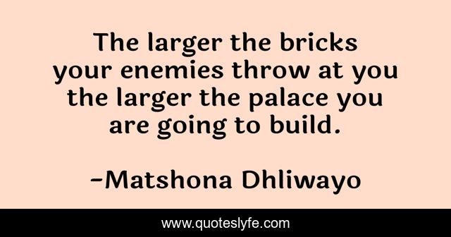 "Matshona Dhliwayo Quotes." Quoteslyfe.com, 2025. Fri. 05 Dec. 2025. <https://www.quoteslyfe.com/quote/The-larger-the-bricks-your-enemies-throw-58335>.