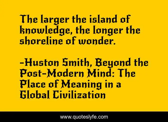 "Huston Smith, Beyond the Post-Modern Mind: The Place of Meaning in a Global Civilization Quotes." Quoteslyfe.com, 2025. Fri. 05 Dec. 2025. <https://www.quoteslyfe.com/quote/The-larger-the-island-of-knowledge-the-30554>.