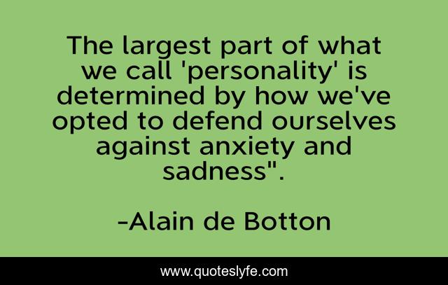 This page presents the quote "The largest part of what we call 'personality' is determined by how we've opted to defend ourselves against anxiety and sadness".". Author of this quote is Alain de Botton. This quote is about sadness, anxiety, personality,.