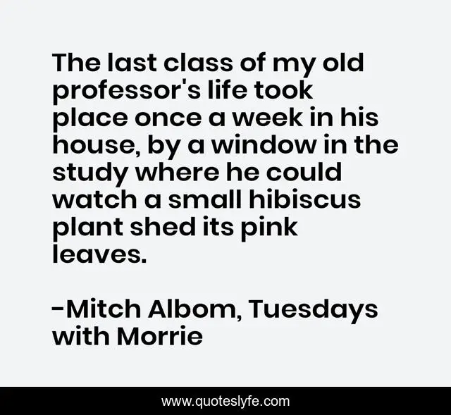 This page presents the quote "The last class of my old professor's life took place once a week in his house, by a window in the study where he could watch a small hibiscus plant shed its pink leaves.". Author of this quote is Mitch Albom, Tuesdays with Morrie. This quote is about shed, flower, last, window, time,.