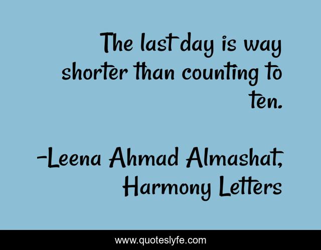 "Leena Ahmad Almashat, Harmony Letters Quotes." Quoteslyfe.com, 2025. Fri. 05 Dec. 2025. <https://www.quoteslyfe.com/quote/The-last-day-is-way-shorter-than-244846>.