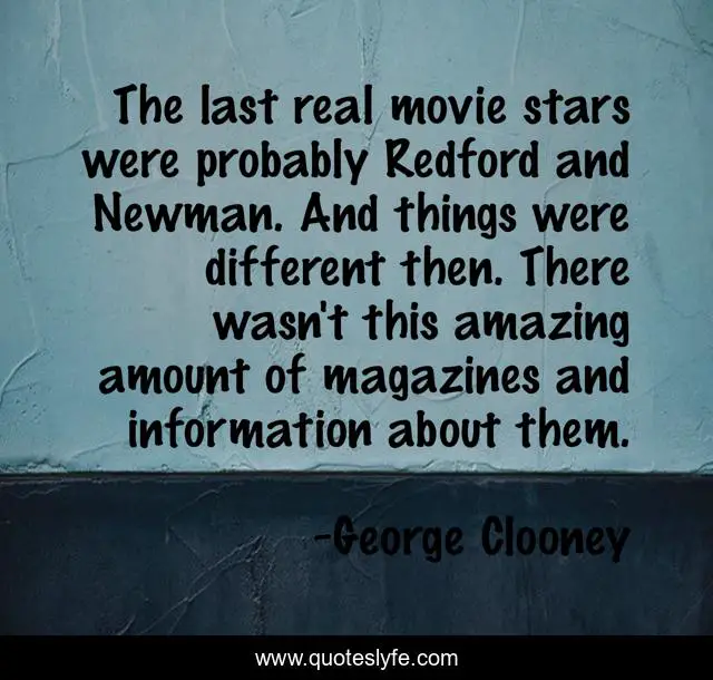 This page presents the quote "The last real movie stars were probably Redford and Newman. And things were different then. There wasn't this amazing amount of magazines and information about them.". Author of this quote is George Clooney. This quote is about real, information, stars,.