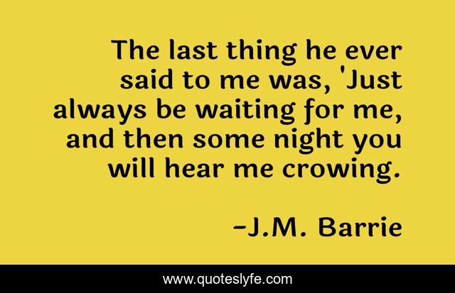 This page presents the quote "The last thing he ever said to me was, 'Just always be waiting for me, and then some night you will hear me crowing.". Author of this quote is J.M. Barrie. This quote is about classics, barrie, young, fantasy, adult, j-m, peter, pan,.