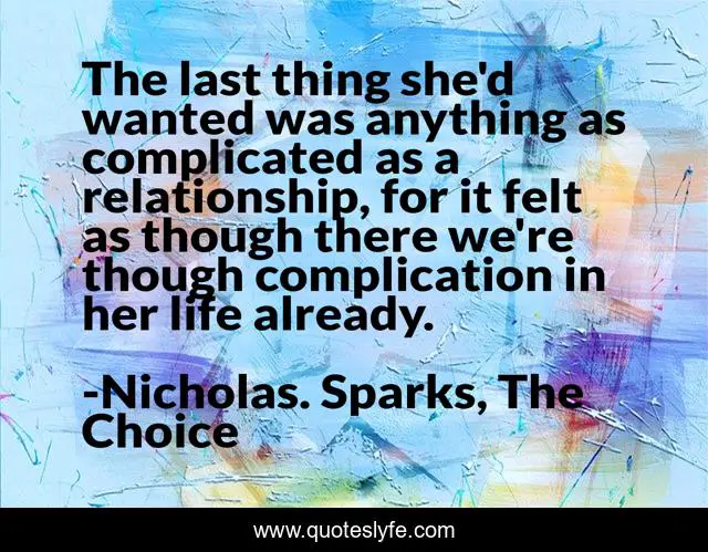This page presents the quote "The last thing she'd wanted was anything as complicated as a relationship, for it felt as though there we're though complication in her life already.". Author of this quote is Nicholas. Sparks, The Choice. This quote is about relationships, relationship, love, comitment, affection,.