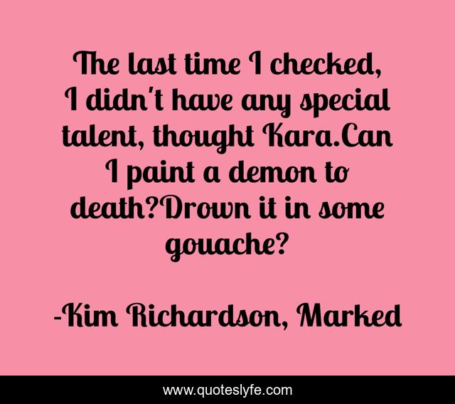 This page presents the quote "The last time I checked, I didn't have any special talent, thought Kara.Can I paint a demon to death?Drown it in some gouache?". Author of this quote is Kim Richardson, Marked. This quote is about kara, humor, demons,.