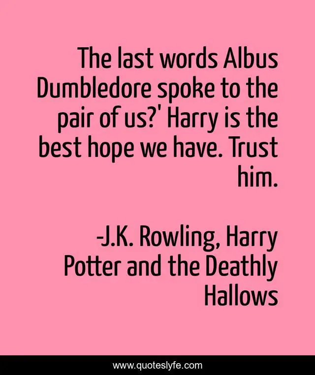 This page presents the quote "The last words Albus Dumbledore spoke to the pair of us?' Harry is the best hope we have. Trust him.". Author of this quote is J.K. Rowling, Harry Potter and the Deathly Hallows. This quote is about last-words, trust,.