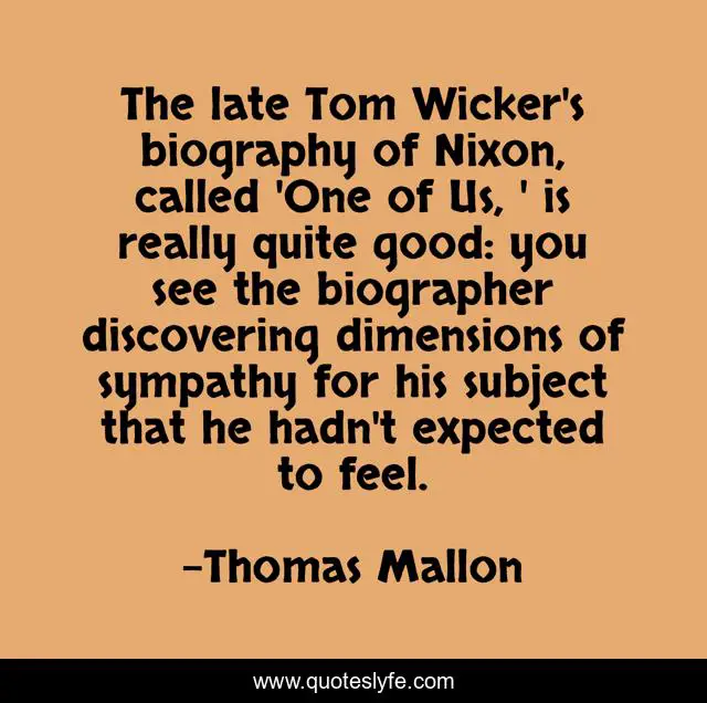 This page presents the quote "The late Tom Wicker's biography of Nixon, called 'One of Us, ' is really quite good: you see the biographer discovering dimensions of sympathy for his subject that he hadn't expected to feel.". Author of this quote is Thomas Mallon. This quote is about see, good,.