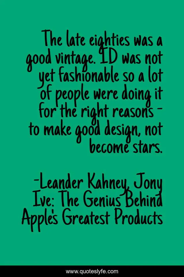 "Leander Kahney, Jony Ive: The Genius Behind Apple's Greatest Products Quotes." Quoteslyfe.com, 2025. Sat. 06 Dec. 2025. <https://www.quoteslyfe.com/quote/The-late-eighties-was-a-good-vintage-234496>.