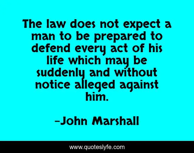 This page presents the quote "The law does not expect a man to be prepared to defend every act of his life which may be suddenly and without notice alleged against him.". Author of this quote is John Marshall. This quote is about justice, trial, guilt, legality, courts, innocence, law,.