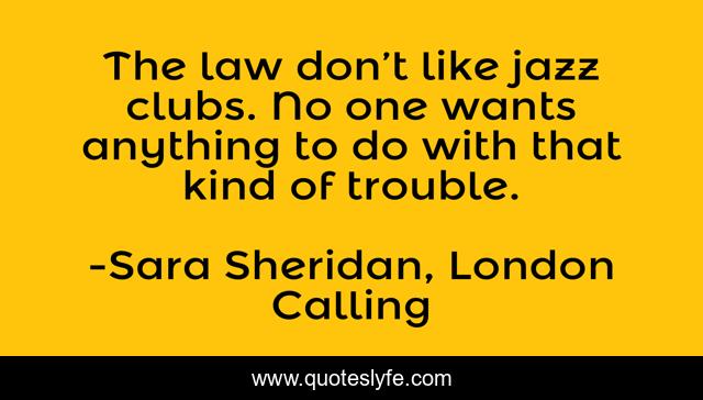 This page presents the quote "The law don’t like jazz clubs. No one wants anything to do with that kind of trouble.". Author of this quote is Sara Sheridan, London Calling. This quote is about trouble, jazz, police, law,.